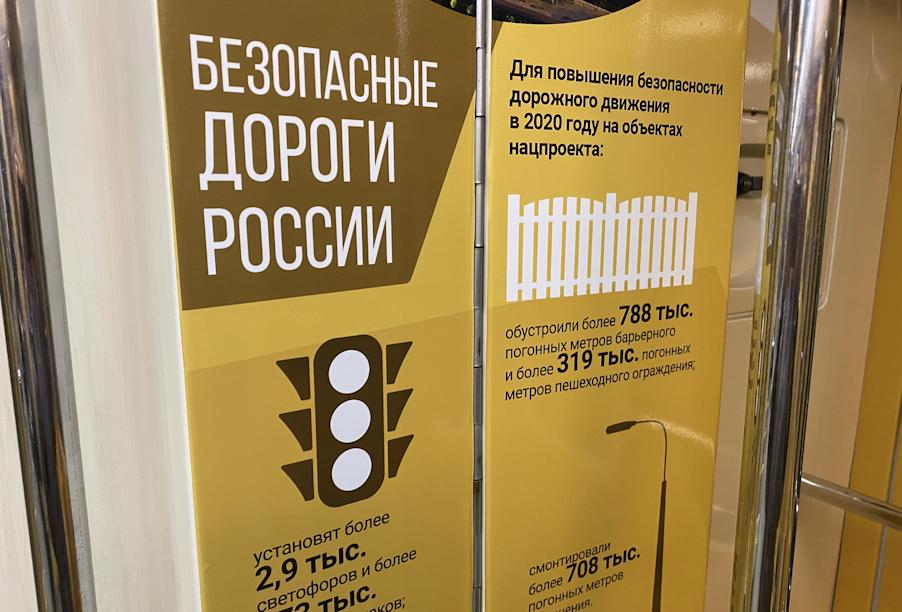 В частности, пассажиры могут ознакомиться с информацией о национальном проекте «Безопасные качественные дороги». На стенах желтого вагона размещены подробные сведения об итогах работ, проведенных в 2020 году в 83 регионах страны.